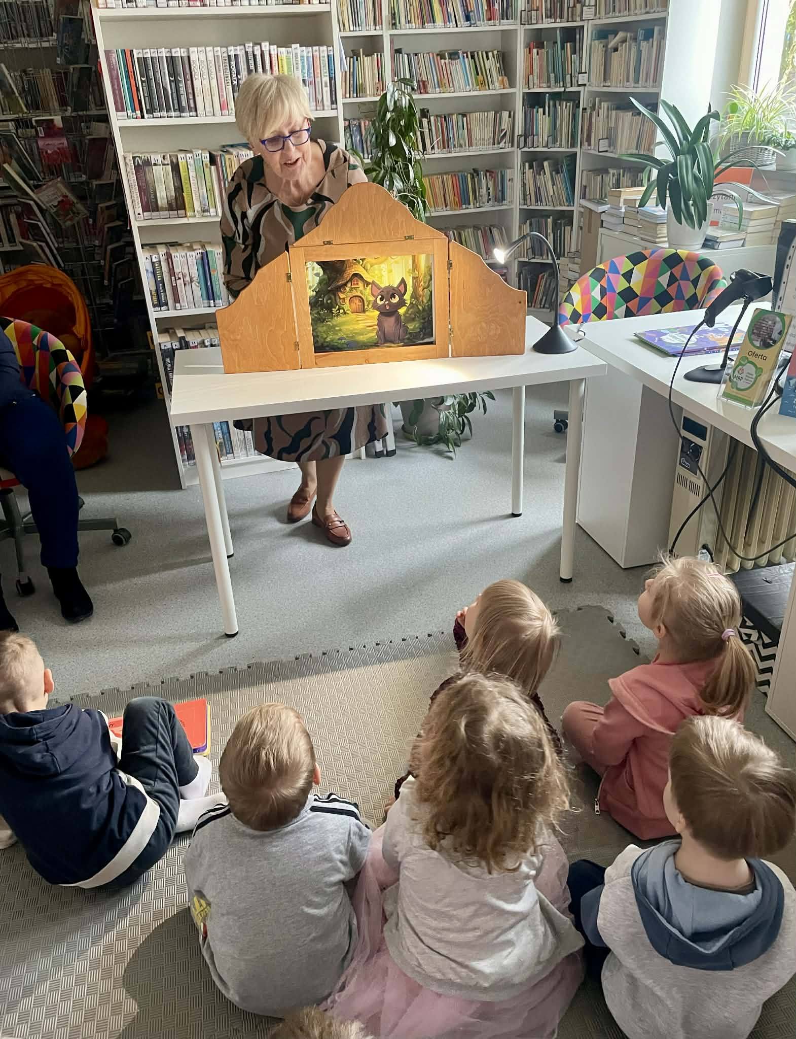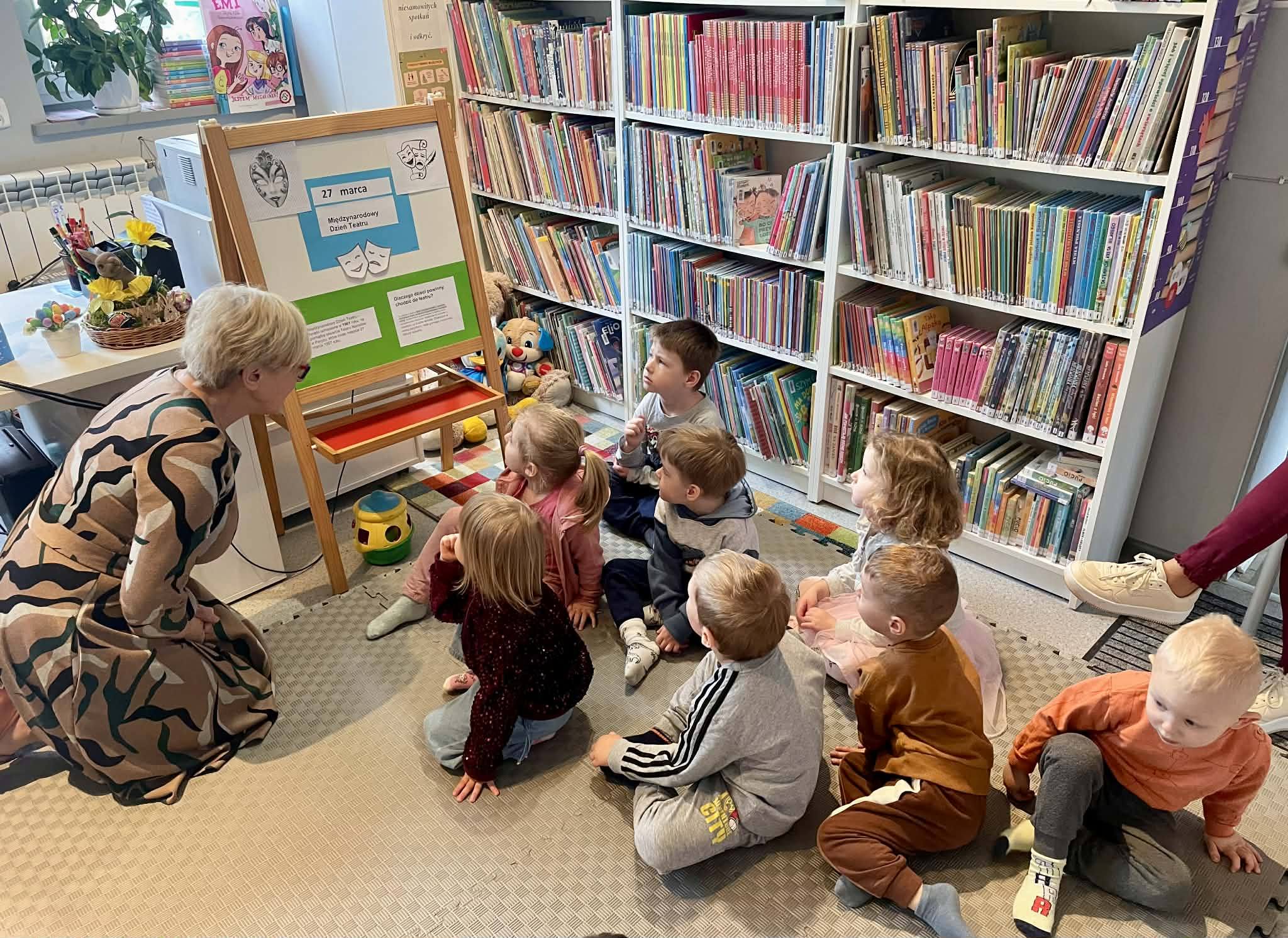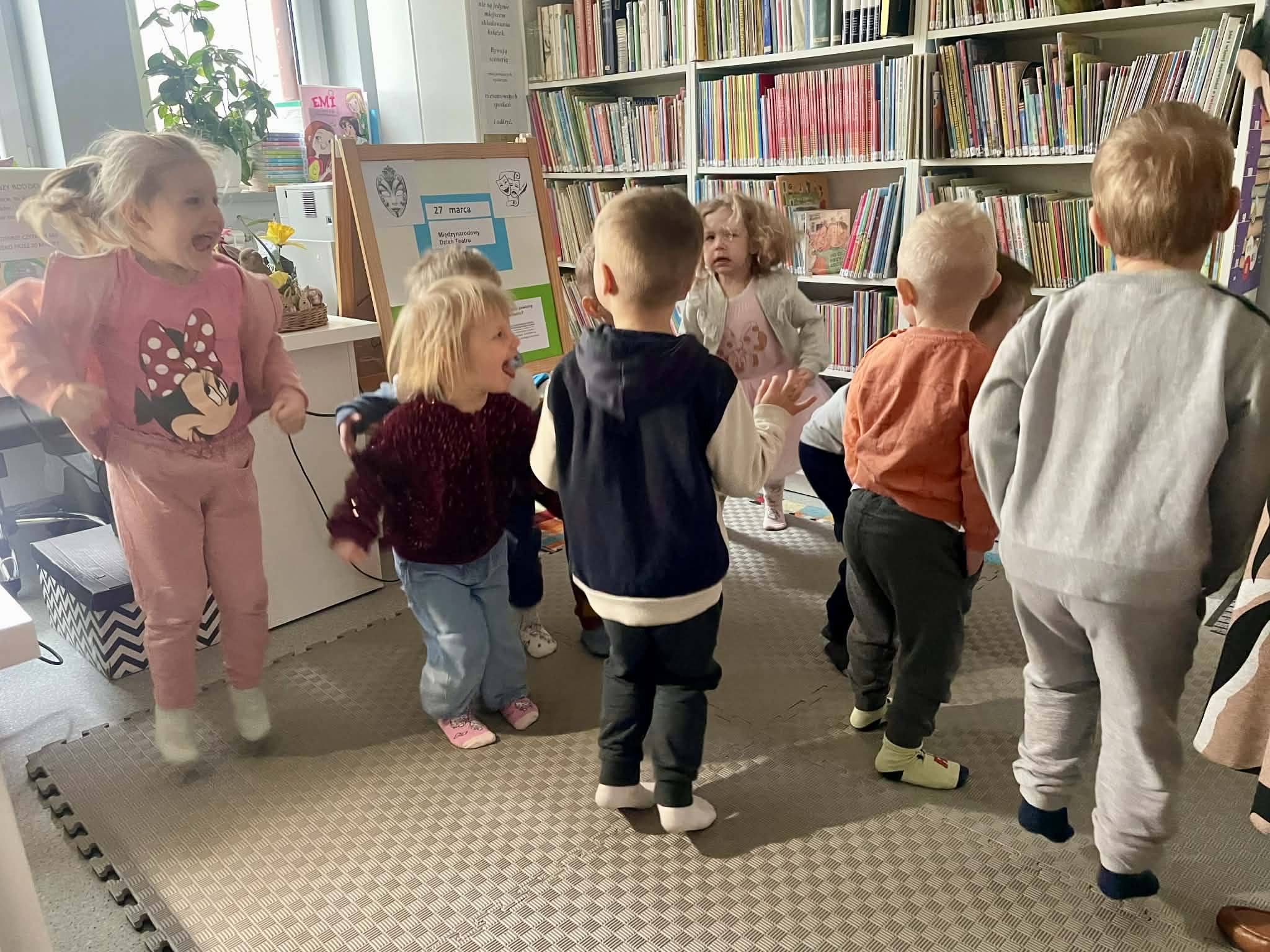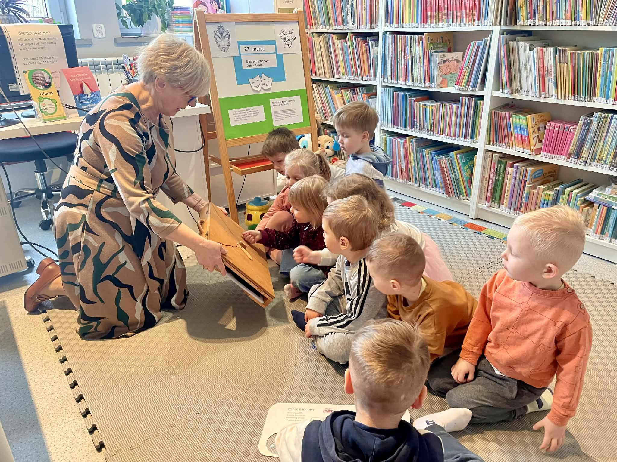 26 marca dzieci z grupy Kotki odwiedziły Miejską Bibliotekę Publiczną w Mlądzu. Podczas wizyty Pani Bibliotekarka zaprezentowała nam drewniany teatrzyk kamishibai czyli wywodzącą się z Japonii tradycyjną technikę opowiadania historii za pomocą ilustracji. Po wysłuchaniu opowieści dzieci z radością uczestniczyły w zabawie ruchowej. Na zakończenie spotkania przedszkolaki zapoznały się z ofertą książek dla dzieci. Serdecznie dziękujemy Pani Bożenie za miłe przyjęcie i ciekawe zajęcia.