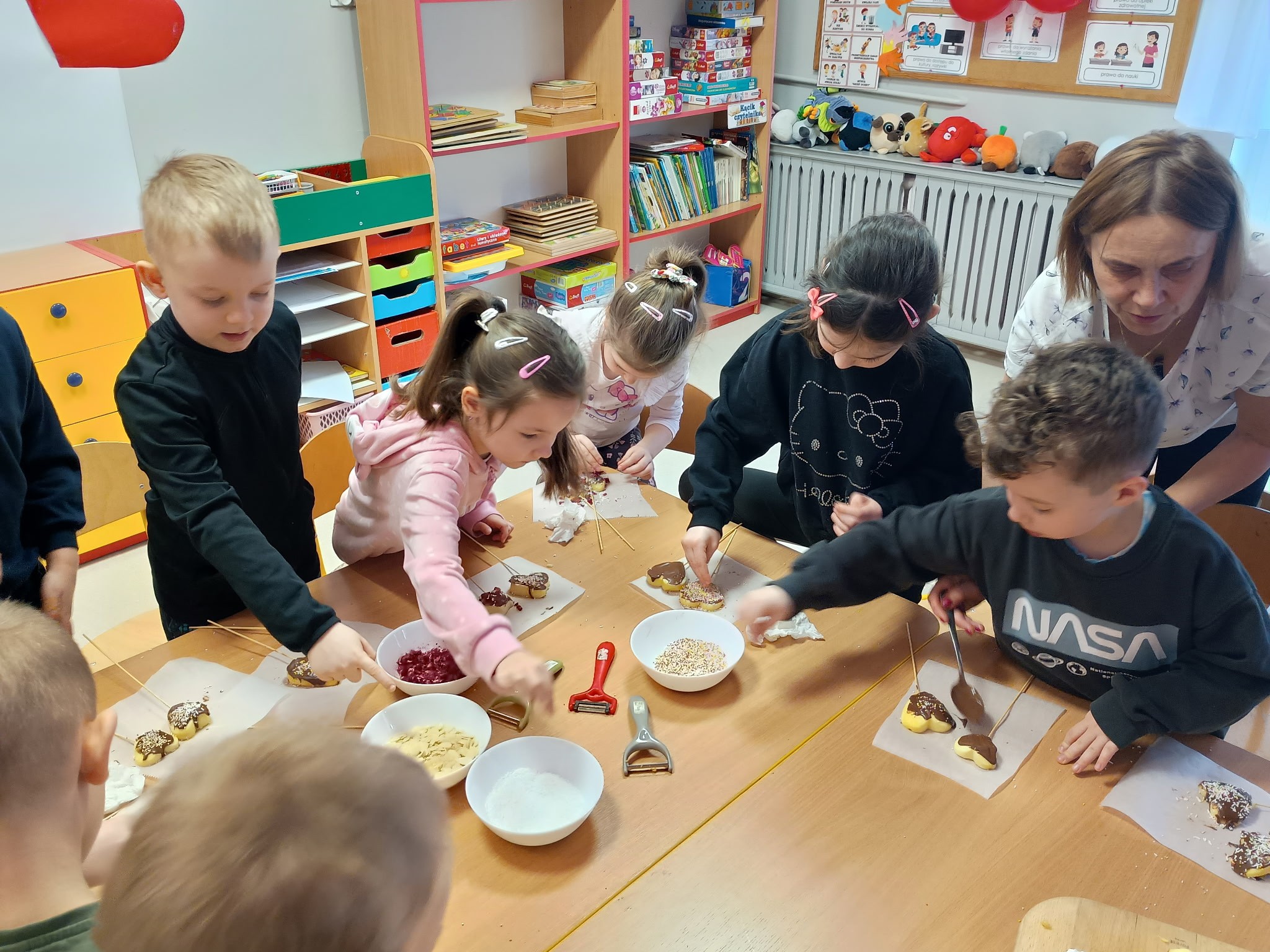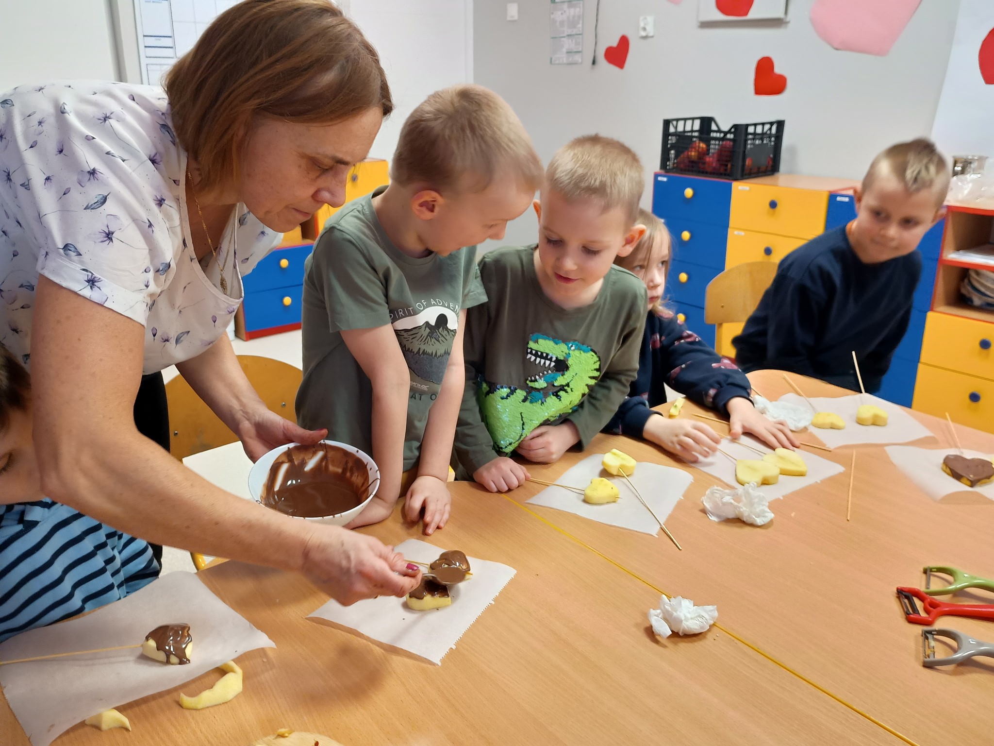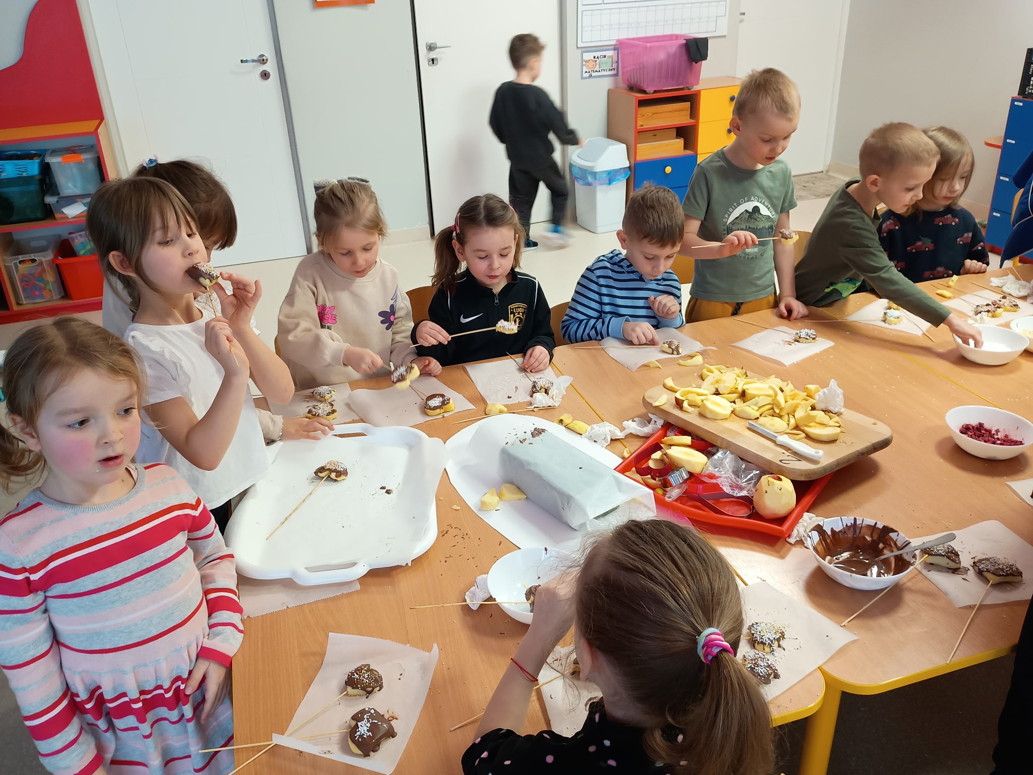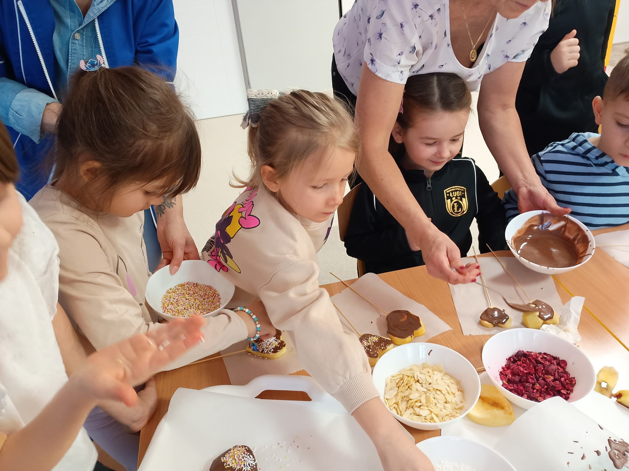 Tłusty czwartek upłynął u nas w twórczej atmosferze. Dzieci z grupy Kotki stworzyły apetycznie wyglądające donuty z papierowych talerzyków pomalowanych farbą i ozdobionych kółeczkami z dziurkacza. Przedszkolaki z grupy Sówki przygotowały jabłkowe lizaki, które udekorowały czekoladową polewą i kolorowymi posypkami. Pomysłowe, kreatywne zajęcia były miłym sposobem na wspólne świętowanie.