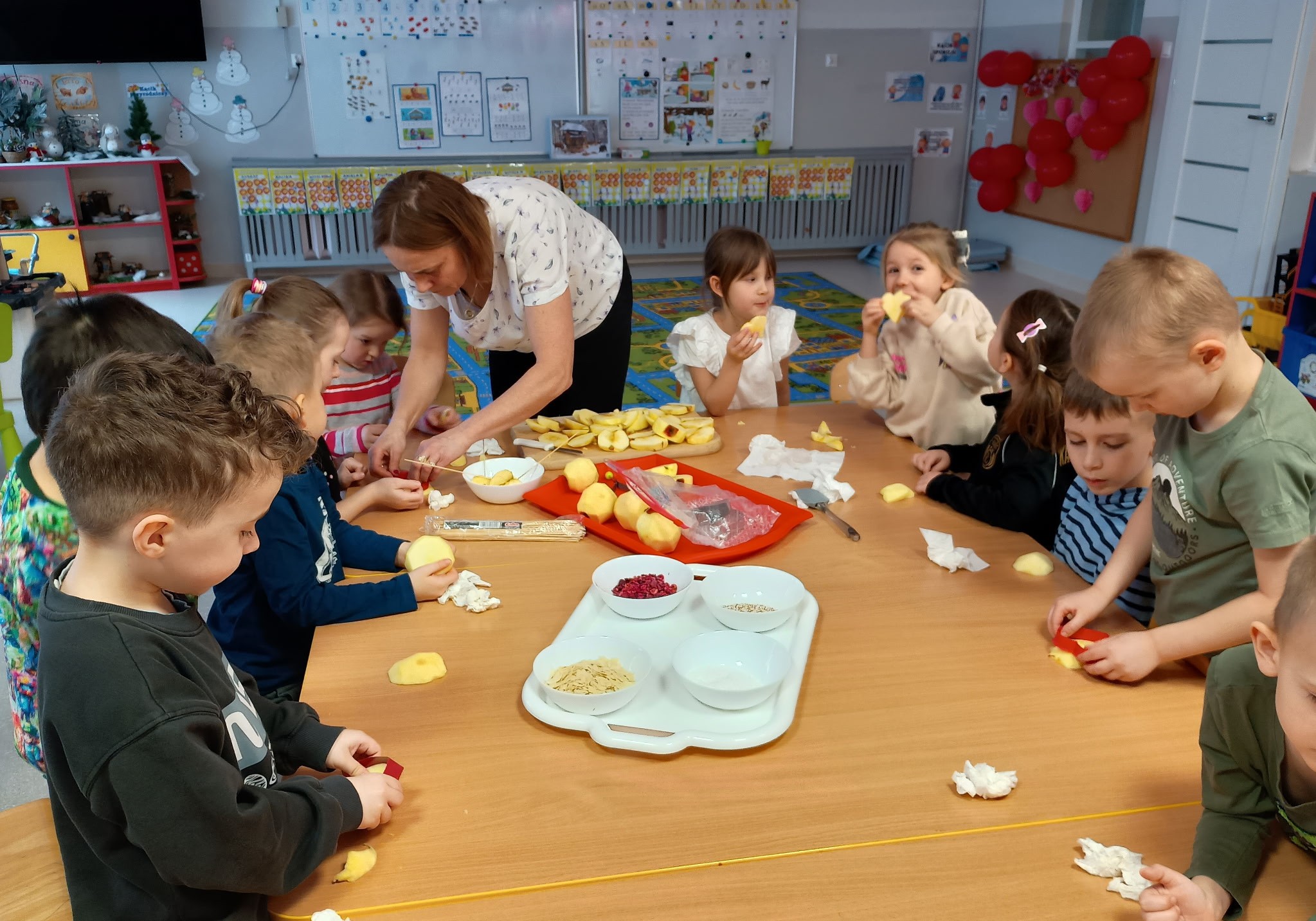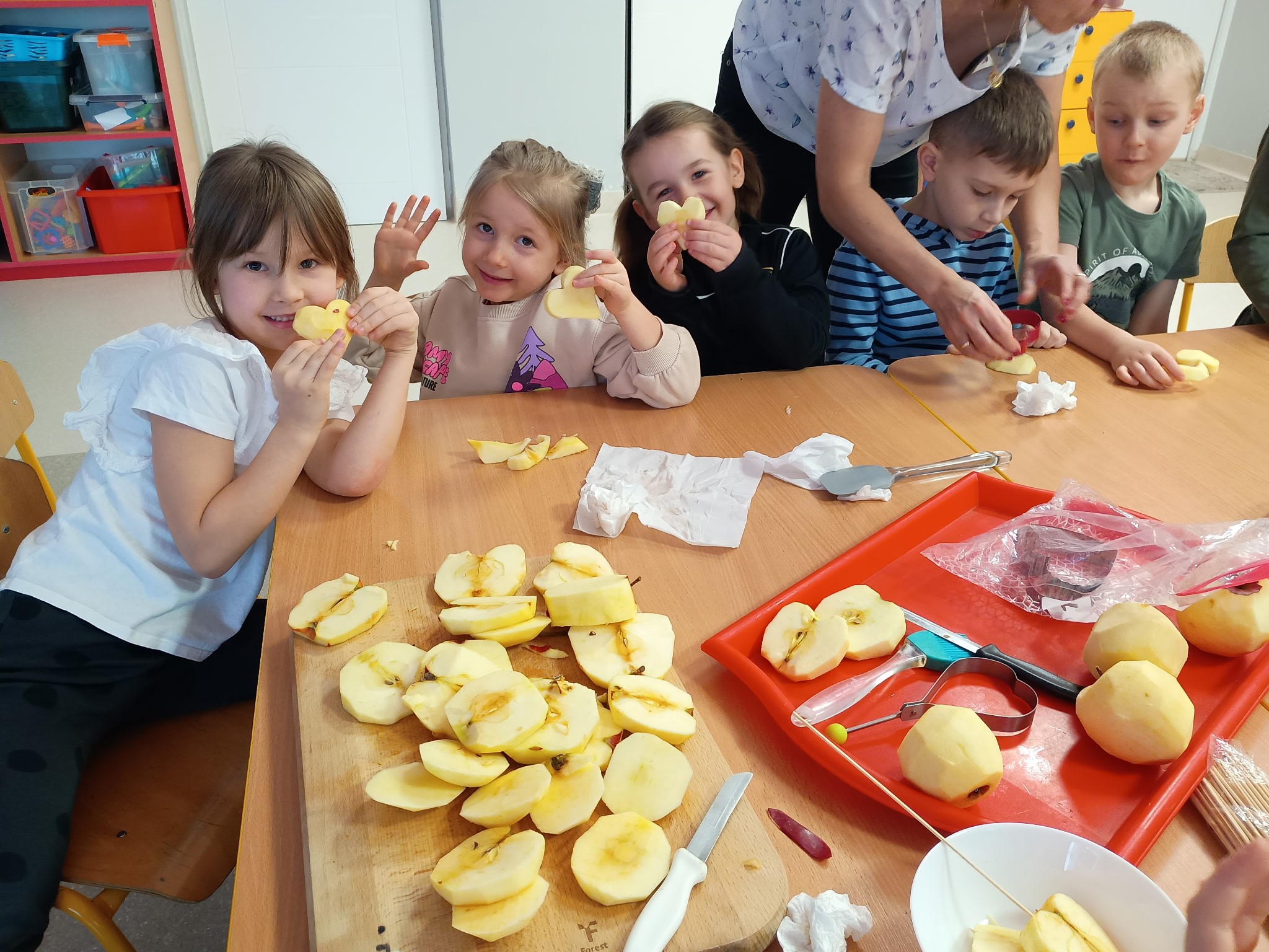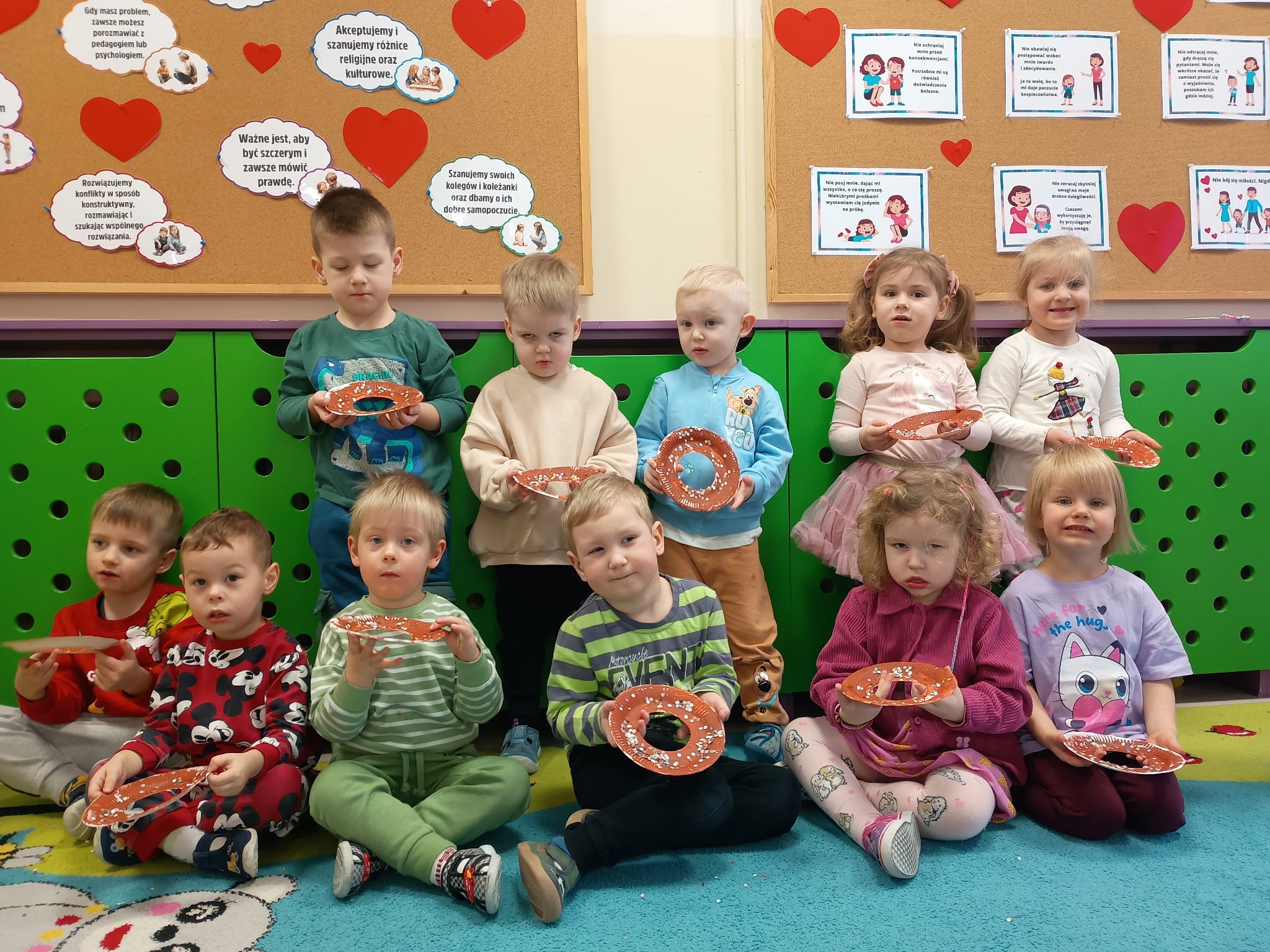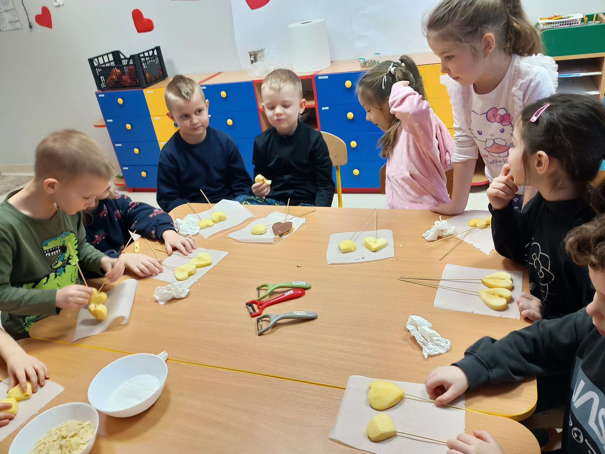 Tłusty czwartek upłynął u nas w twórczej atmosferze. Dzieci z grupy Kotki stworzyły apetycznie wyglądające donuty z papierowych talerzyków pomalowanych farbą i ozdobionych kółeczkami z dziurkacza. Przedszkolaki z grupy Sówki przygotowały jabłkowe lizaki, które udekorowały czekoladową polewą i kolorowymi posypkami. Pomysłowe, kreatywne zajęcia były miłym sposobem na wspólne świętowanie.