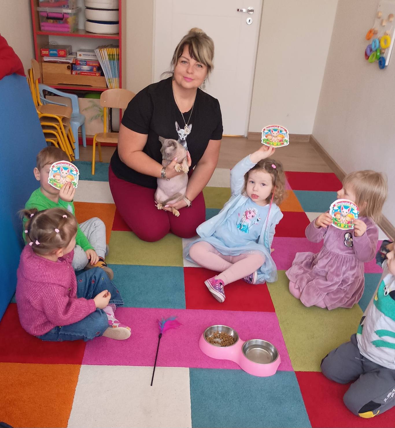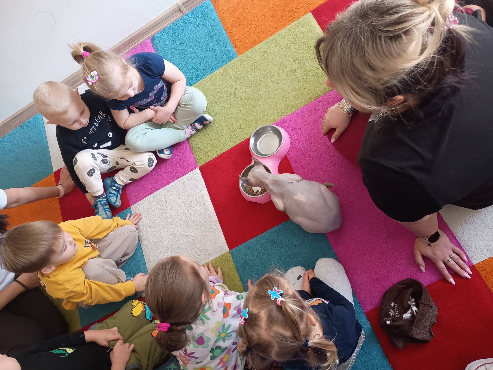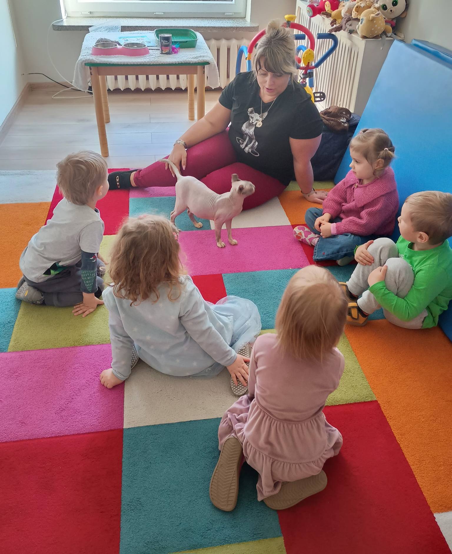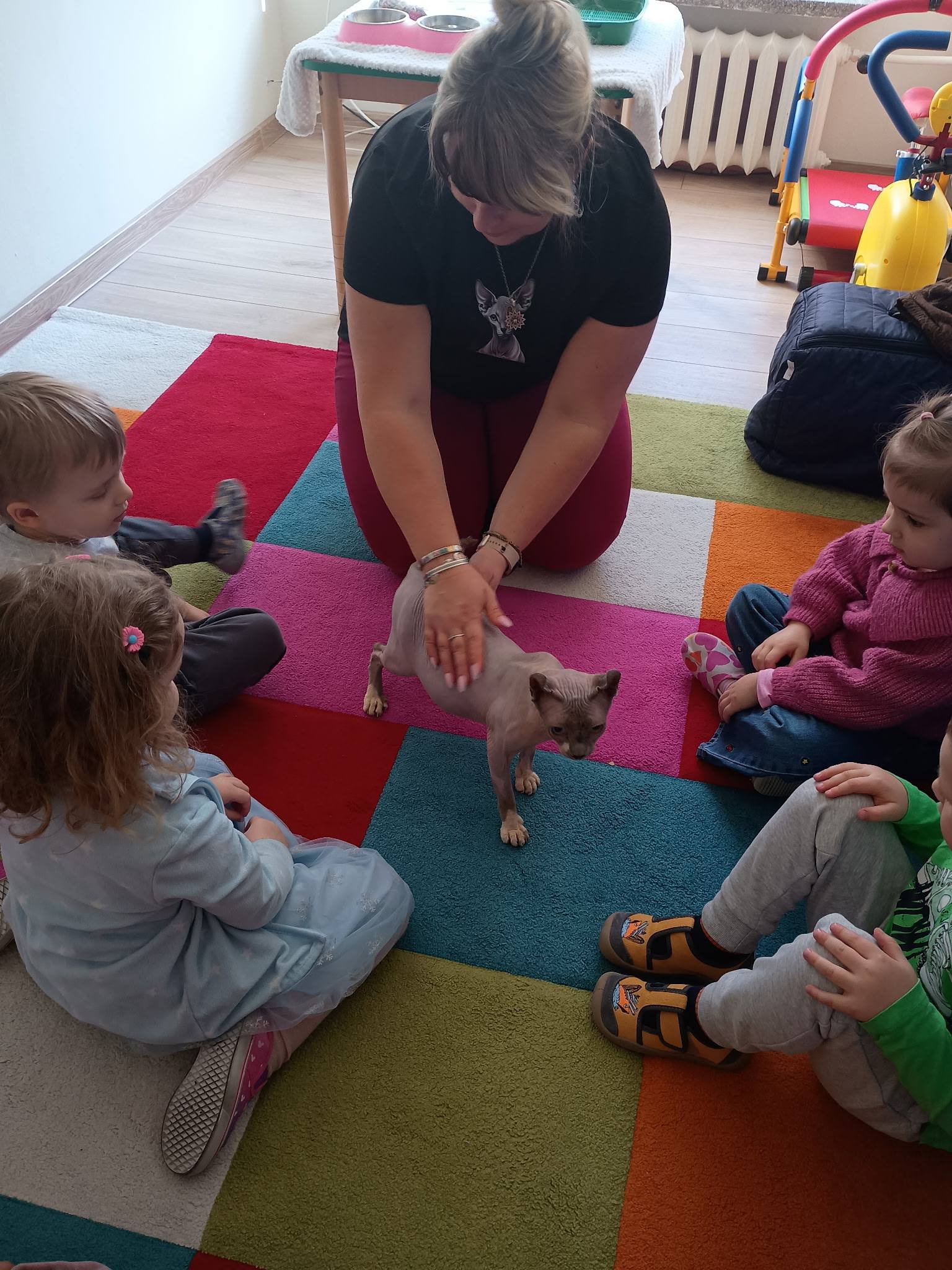 W dniu 10 marca odbyły się zajęcia edukacyjno - terapeutyczne z udziałem kota, tym razem dla dzieci z grupy najmłodszej. Celem zajęć było rozwijanie empatii, wrażliwości oraz uważności na potrzeby innych. Kot rasy Sfinks, który nie posiada sierści wzbudził u dzieci duże zainteresowanie. Przedszkolacy obserwowały zachowanie kota, dowiedziały się o jego potrzebach. Uczyły się także o delikatności oraz szacunku wobec zwierząt. Zajęcia prowadziła Pani psycholog z naszego przedszkola. Dziękujemy .